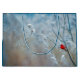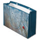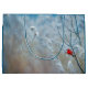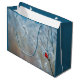 En stor presentväska med ett scenfotografi som innehåller en ljusröd kardinal. Kontrasterade mot en uttorkad vinterbakgrund med en varsam nedgång i snö.