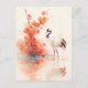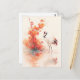 This stunning design features an elegant red-crowned crane shown standing with quiet dignity in shallow, shimmering water. Rendered in a lush, textured watercolor style, the crane has brilliant white plumage with striking black and deep red tail feathers and a vibrant red crown atop its slender head. The bird is positioned gracefully next to a magnificent branch heavy with hand-painted orange blossoms and buds, which is perfectly reflected in the calm water below. Behind the crane, soft peach and orange watercolor washes create a hazy, atmospheric background that highlights the bird's elegant form. Whimsical red paint splatters and delicate white blossoms drift through the airy scene, creating a sense of natural grace and artistic flair. The overall aesthetic is sophisticated, peaceful, and full of natural beauty, making it an exceptional choice for bird lovers and fans of traditional Asian-inspired botanical art. This elegant crane postcard is a perfect choice for sending a "thinking of you" note or a meaningful greeting to a friend who admires the symbolic beauty of cranes. You might choose to use this artistic card for a spring-themed dinner party invitation or to celebrate a professional achievement with a touch of wild elegance for your colleagues. It also makes a beautiful decorative piece for a tranquil office wall or a stylish addition to a nature journal as a small token of serene beauty. This versatile design is also an excellent choice for a housewarming message, a graduation thank you note, or as a heartwarming way to share a message of joy for any situation or event.