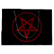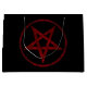 Röd, inverterad, texturerad pentagram i cirkel, på svart bakgrund. Oockult-symbol. 666