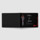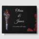 En röd drake på ett svärd och röd ros mot en svart bakgrund.