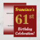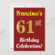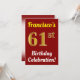 Den här födelsedagsfest inbjudan-designen innehåller ett meddelande som "Francisco's 61:a födelsedagsfirandet!", där namn kan anpassas och där siffran "61st" har ett faux guld-liknande utseende. Den har också en röd färgad. Händelseinformationen på baksidan kan anpassas. Den skulle kunna användas till inbjudan till någons sextio första födelsedagsfirande eller födelsedagsfest. [~Z0000120]