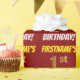 Den här pappra designen innehåller ett meddelande som "FIRSTNAME's 1st BIRTHDAY!", där "1st" har ett utseende som liknar faux/imitation guld-liknande färg och med namn och "BIRTHDAY" i ett roligt, fet teckensnitt. Namn är anpassade, och bakgrunden är färgad röd. Att packa pappert som detta skulle kanske kunna användas när man fyller på födelsedagskalkyl som ges till någon i firande på deras första födelsedag. [~Z0000204]