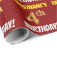Den här pappra designen innehåller ett meddelande som "FIRSTNAME'S 4e födelsedagen!", där "4:e" har ett utseende som liknar faux/imitation guld-liknande färg och med namn och "BIRTHDAY" i ett roligt, fet teckensnitt. Namn är anpassade, och bakgrunden är färgad röd. Att packa pappert som detta skulle kanske kunna användas när man fyller på födelsedagskalkyl som ges till någon i firande på deras fjärde födelsedag. [~Z0000204]