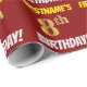 Den här pappra designen innehåller ett meddelande som "FIRSTNAME's 8th BIRTHDAY!", där "8th" har ett faux/imitation guld-liknande färg och med namn och "BIRTHDAY" i ett roligt, fet teckensnitt. Namn kan vara personlig, och bakgrunden är färgad röd. Att packa pappert som detta skulle kanske kunna användas när man fyller på födelsedagskalkyl som ges till någon i firande på deras åttonde födelsedag. [~Z0000204]