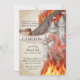 Den här anpassningsbar-festinbjudan innehåller ett stil fantasytema med vattenfärg. En bild av en röd drake bildas framför ett sagoläge med brinnande flammor runt honom. Bergsområdena brinner också i avstånd. Bakgrunden är en papper utformning av ett fäste med ornate guld ram för att likna en sida från ett gammalt bok.