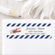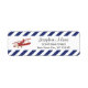 Returetiketter med röd vintage flygplan och blå rand-bakgrund.