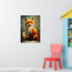 A portrait of a fox sitting in a snowy forest. The fox has bright orange fur with a white chest and tail tip. The background features pine trees covered in snow, creating a wintery atmosphere. The fox's expression is calm and serene. The overall mood is peaceful and inviting. The image is digitally created with a realistic style. Perfect for kids room.