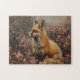 Ett vackert rödräv sitta i fält av vilda blommor av rosa som fångats i en oljemålning.