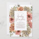 Den här eleganten med inbjudan till virtuell/zoom/facebook/online babydusch innehåller gerbera/daisy i rött, ro i orange och dahlias i vitt i vattenfärg på vit bakgrund. Baksidan har en burgundröd bakgrund med blommönster. Anpassa den efter dina behov. Du hittar matchande produkter i min butik.
