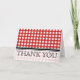 Ett tackkort med röd och vit gingham-bakgrund och svart rosa. Texten läser "Tack" över ren bakgrund. Anpassa med ett meddelande inuti.