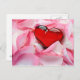 Fin och romantisk illustration med ett rött glashjärta på en bädd av vita rosa ros-petaler.