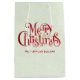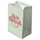 En presentsäck med en finare-typografisk design med ett festivt teckensnitt i rött som säger God jul.