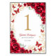 Red gold Quinceanera celebration table number cards. Features, script font, gold butterflies, watercolor roses and tiara. Perfect for an elegant princess style glam celebration. Personalize with your own details. Printed Zazzle invitations or instant download digital printable template.