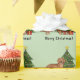 Desteis ursprungliga tecknad illustration av en söt röd jackar färg Golden Retriever-hund. Hund står vid ett festligt Julgran med röda prydnadsföremål och gult, en vit pärlträdgård och en gult stjärna på träd. Det finns också två inslagna presenter vid träd och det finns ett textområde som nu lyder: "God jul!". Bakgrunden till färg är ljust grönt.