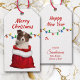 På framsidan av den här märkrn för gåvor i Helgdag är en bild av en ädel röd och vit valp i Gräns i en julklapp. Bakom hund finns en sträng med färglöst Helgdag ljus. I texten överst står det "God jul". Baksidan av märkrn upprepar bilden av ljus, med texten fält i rött för att du ska kunna anpassa.