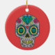 Den här spännande prydnadsformen Day of the dead stil har en skalle med blå kristaller i grönt överst, med ro, hjärtan och blixtar i gult. Skallen ställs mot en röd bakgrund för ett festligt utseende.