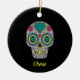 Anpassa den här ornamenten genom att skriva ditt namn eller mottagarens namn i avsnittet Personlig. Du kan också ta bort platshållaren namn om du inte vill ha någon text. Den här spännande prydnadsformen Day of the dead stil har en skalle med blå kristaller i grönt överst, med ro, hjärtan och blixtar i gult. Skallen ställs mot en svart bakgrund för ett festligt utseende.