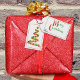 Den här presentdesignen på dubbla-sidan har en färgstark märkre av abstrakt, färgband med rött, grönt och guld Julgran på framsidan och röd och grönt "God jul"-typografi på baksidan. Träd har en faux guld glitter stjärna i toppen och i grönt.