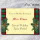En anpassningsbar som matar, bakar eller tar fram ett klistermärke med texten "Från Helgdag Kitchen of" och ett rum för ditt namn i röd blackletter och blocktext i brunt och en helgdag av grovt sprit på röd och grönt som läggs i mönster och en rustisk bakgryta. För speciella julbalar, lättar eller recept i burk.