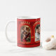 Jul mugg med anpassningsbar-foton på klassiskt rött snyggt och guld med stiliserat snöflingor. Snygg med en familjefärg eller för att fira en första jul.
