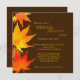 Stor röd och guld löv med en chokladbrun bakgrund designad på anpassningsbar Inbjudningskort för möhippa. Konstnärliga, unika inbjudningskort underbara för elegant bröllop-duschen party under hösten! All exempeltext kan anpassas helt och hållet med din egen formulering. Du kan också ändra typsnitt, storlek och färg på texten. (Du hittar de bröllop-essentialer och -favörer som passar i den här butiken, Möhippa himlen. Kontakta ujean4791@gmail.com för anpassningsbar och/eller samordning av bröllop-kontorsmaterial.)