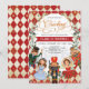 Whimiscal nutcracker tog födelsedagsinbjudan i festive Red och guld.