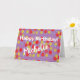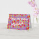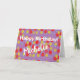 Födelsedagskort med en digitalt designad dockningsbild som visar rött, gult och blå prickar av oljefärg på lila. Meddelandet läser Grattis på födelsedagen med namn. Anpassa ordalydelsen enkelt genom att redigera alla fält i malltexten. Tack för att du visar mina design.
