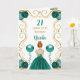 Den här inbjudan till födelsedagskort innehåller en elegant guld ram, en vacker prinsessa med rött hår och en tealblå klänning, blommor och ballong.
