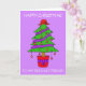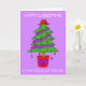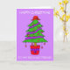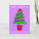 En tecknad Julgran med en röd hatt ovanpå den, och dekorerad med röda bubblor. Bilden följer med Lycklig-julen till min rödhatt-vän i ord.