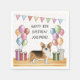 Desteis ursprungliga tecknad av en röd trefärg jackar hund av färg Pembroke Welsh Corgi. Hund placeras i en färglös födelsedagsinställning med färg-ballonger, gåvor och en buntbanderoll. Pastellernas färg omfattar rosa, grönt, blått, rött, orange och lila. Hund står på en gult av trä golv struktur och bakgrunden har en lekfull pastellprick färg polka punkt mönster. Det finns också ett anpassningsbara textområde.