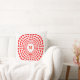 Dekorativ kudde med sju vackra hjärtcirklar och M brev i centrum. Röd och vit färg. Kärlek är överallt!