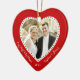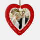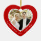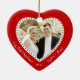 Foto på anpassningsbarna av rött hjärta vår första julprydnad med anpassadets foto och text - du kan lägg till bild, namn och år - i form av ett hjärta