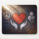 Graffiti of a pair of hands under a red heart with a peace sign on an urban brick wall