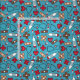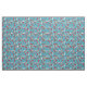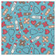 Fabriker för sjuksköterskor, läkare och hälso- och sjukvårdspersonal i vitt med ett mönster av stetoskop, medicin, termometrar, band-aids i brunt och beige samt hjärtan mot blå bakgrund.