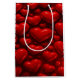Glossala röda hjärtan flyter bland lysande bubbelformer på djup bakgrund. Den här teckningen glöms med glöd och elegans. Skapat med hjälp av AI enligt DigitalGemArt:s unika uppmaning.