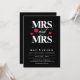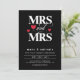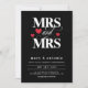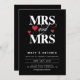 Romantisk typografisk bröllopsinbjudan i svart för en lesbisk bröllop med MRS och MRS skriven i fetstil, vitt brev med ett snabbt och rött hjärta. Lägg till information om bröllop i bakgrunden.