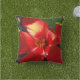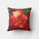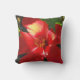 Bilden på Dekorativ kudde är ett originalfoto av ZoeSPEAK på en röd hibiscus-blomma. I fotot är blomningens mittpunkt blastad av mycket starkt solljus som genomsöker en öppning mellan gultens grönt löv av busken. Gultens stämpel omges av blommans ljusröda bläck, som ser gult ut där sol är det ljusaste. Resten av blomman faller ner i skuggorna i ett djupt rött färg mot oliv grönt löv.