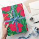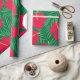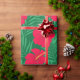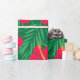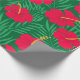 Det här är vackra röda Hibiscus-blommor på den tropiska grönten handflatan lämnar mönster. Det är underbar tittar gåva papper för party med tropiskt tema