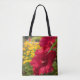 En liten grupp vackra röda hibiscus blommor i en solig trädgård.