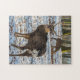 Vild röd hjort i ett snöskogar med taggen tittar direkt i kameran.