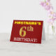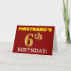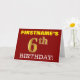 Den här födelsedagskalenderns hälsningskort innehåller ett meddelande som "FIRSTNAME's 6e BIRTHDAY!", där "6e" har ett utseende som liknar guld/imitation färg. Mottagarens namn i framkanten kan vara personlig, och frambakgrunden är färgad röd. Det innehåller också ett hälsning-meddelande från anpassadets födelsedag på insidan. Ett sådant här födelsedagshälsningskort kan kanske ges till någon i firande på sin sjätte födelsedag. [~Z0000184]