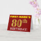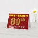 Den här födelsedagskalenderns hälsningskort innehåller ett meddelande som "FÖRST-NAMN's 80:e BIRTHDAY!", där "80:e" har ett utseende som liknar guld och liknar färg. Mottagarens namn på framsidan kan anpassas, och frambakgrunden är färgadens röd. Det innehåller också ett hälsning-meddelande om personligens födelsedag på insidan. Ett sådant här födelsedagshälsningskort kan kanske ges till någon i firande på deras åttioårsdag. [~Z0000184]