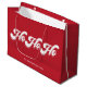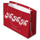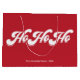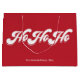 Julens röda och vita presentsäckar med Ho Ho Ho-skripttext och vit utbytbar text - du kan byta familj namn och år.