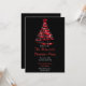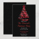 En röd julgran på svart bakgrund. Baksidan av inbjudan är svart med snö mönster