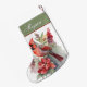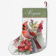 Söt julstrumpor, med vackra teckningar av en manlig röd kardinal, sitta på blommar gren. Djurtätheten överst görs i sage grönt, med redo för vitt eget namn för att anpassa sig.