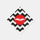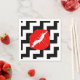 Ljusröd läppar mot svart och vit schevron eller zigzag mönster.