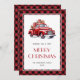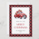 Anpassningsbar Red buffalo plaid God jul-kort med ett klassiskt rött lastbil. Anpassa enkelt det här röda lastbil-helgdag-kortet med din familj namn.