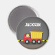 Utformningen har en söt liten byggpojke i en säkerhetshatt och orange väst som kör ett rött lastbil. Design behandlas med en skuggeffekt som gör att designen visas. En gult och svart lutad rand mönster i bakgrunden som är vanligt förekommande i byggzoner och på platser som är Underbara för pojkar som kärlek bygger fordon och lastbil leksaker! Anpassa med namn för att göra extra speciellt!