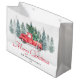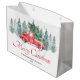Vintage christmas-presentpåsar med en enkel vit bakgrund, vattenfärgad gryta träd, ett rött lastbil, ett julafton träd, ord, "god jul", ditt namn och året.