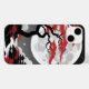 A breathtaking anime-style landscape dominated by a gigantic full moon, glowing against an inky black sky. Below, jagged black rocks and twisted bare trees , their branches like skeletal fingers with red leaves. A cluster of traditional buildings. The entire scene is bathed in eerie moonlight, casting sharp contrasts between the red, white, and black palette.